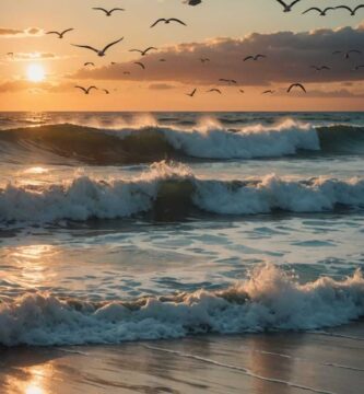 Dramatic 4k Beach Seascape with Soaring Birds Under a Moody Cloudy Sky