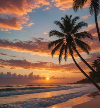 4K Vibrant Beach Sunset Walk Amid Tropical Palm Trees Reflecting Ocean Hues