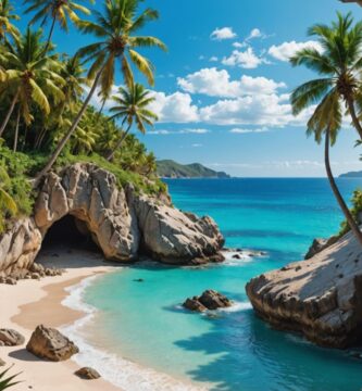 4K Beach View from a Rocky Cave Showcasing Turquoise Water, Pink Sand, and Lush Cliffs