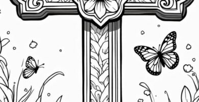 Colorful Easter Cross Coloring Page Surrounded by Beautiful Butterflies and Flowers