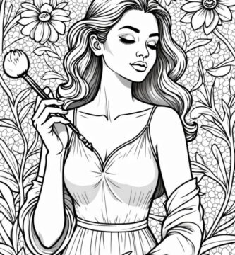 Free Printable Coloring Pages of an Elegant Woman in a Floral Garden Scene