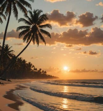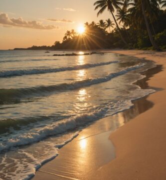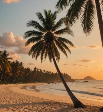 4K Beach Sunset Serenity with Turquoise Waves, White Sand, and Palm Trees