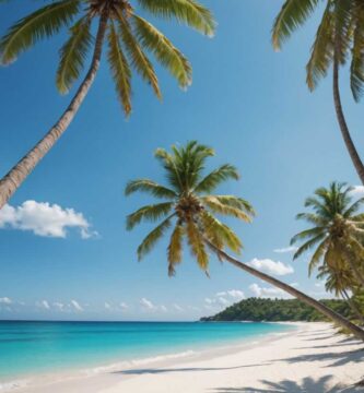 Discover the Serenity of a 4K Beach Paradise with Lush Palms and Mountain Backdrop