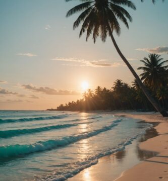 4K Beach Serene Tropical Sunset with Palm Trees and Gentle Waves for a Peaceful Escape