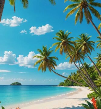 4K Beach Tropical Paradise with Palm Trees and Shimmering Water Reflections