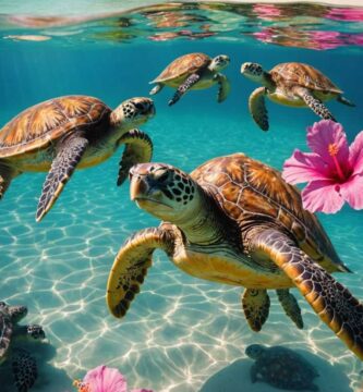 Serene Leopard Swimming with Vibrant Orange Hibiscus in a Clear 4K Beach Scene