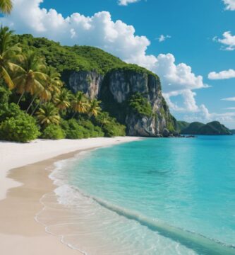 4K Tropical Beach Paradise with Turquoise Waters, Lush Cliffs, and Palm Trees