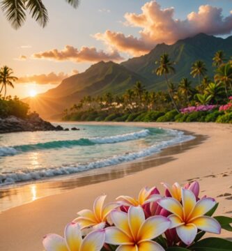 4K Beach Sunset Serenity with Plumeria Flowers and Palm Tree Silhouettes