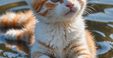 Dreamy Marble Water Reflections: A Serene Journey with an Orange Kitten