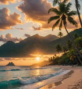 Serene Tropical 4K Beach View with Lush Mountains, Calm Lake, and Vibrant Hibiscus Flowers