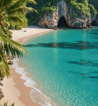 4K Beach Turquoise Cove with White Cliffs and Tropical Pink Flowers for a Serene Escape