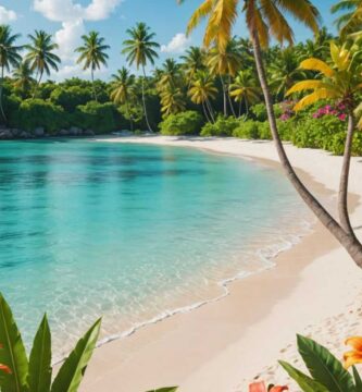 4K Escape: Tropical Palm Trees, White Sand, and Turquoise Seas with Mountain Serenity