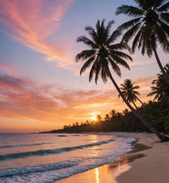 4K Beach Tropical Sunset with Palm Trees and Coconuts for a Serene Coastal Escape