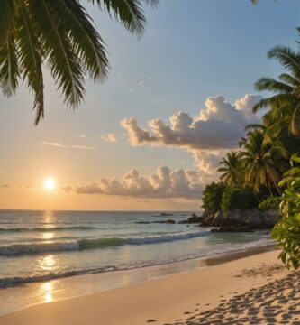 4K Beach Tropical Paradise: Golden Sands, Palm Trees & Dramatic Green Mountains Under a Blue Sky