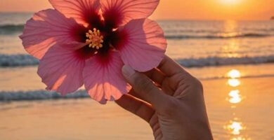 Vibrant Pink Hibiscus on a Sandy Shore at Sunset with Glowing 4K Beach Waves