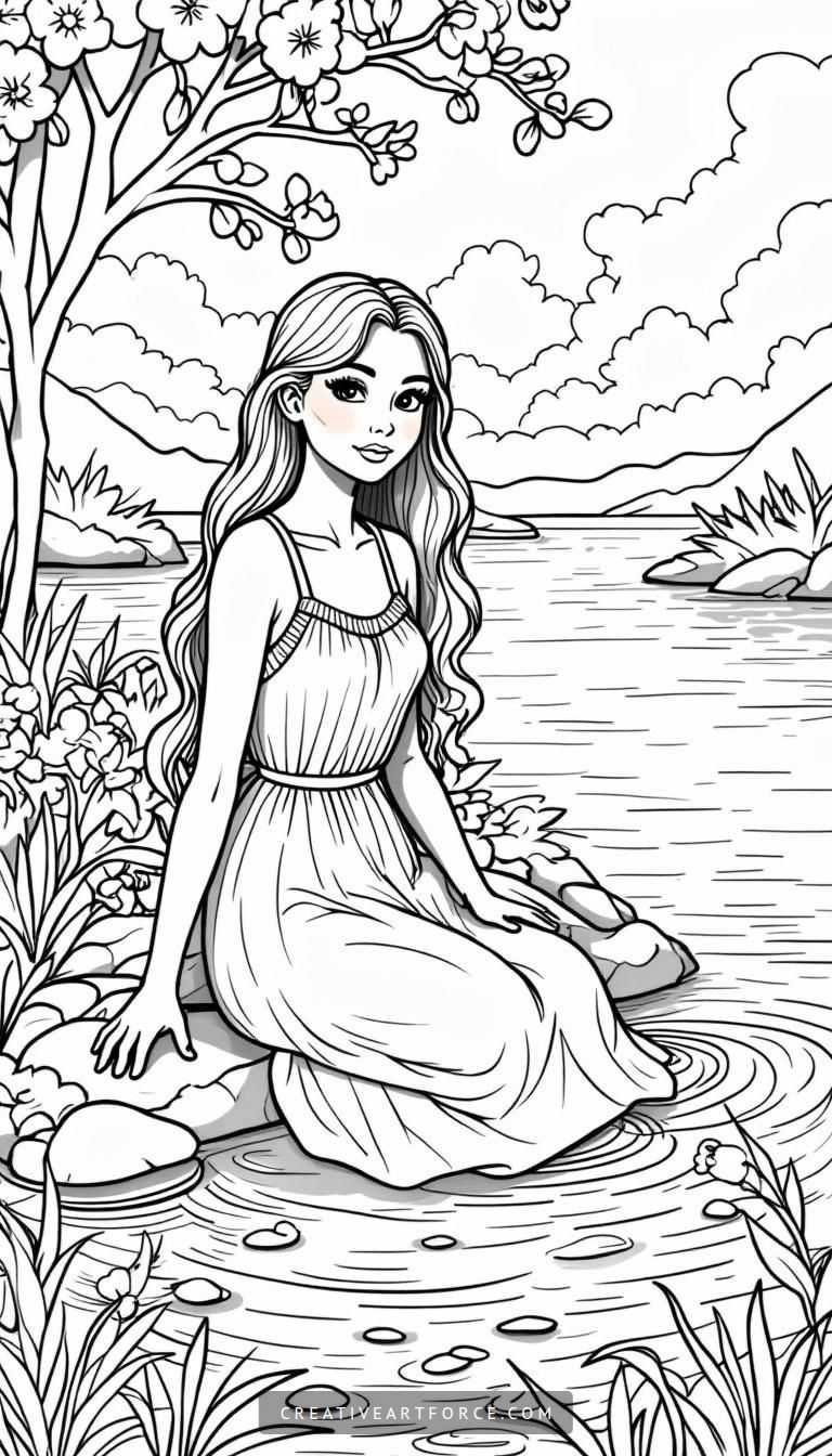 Free Printable Coloring Pages of a Serene Woman by the Riverside