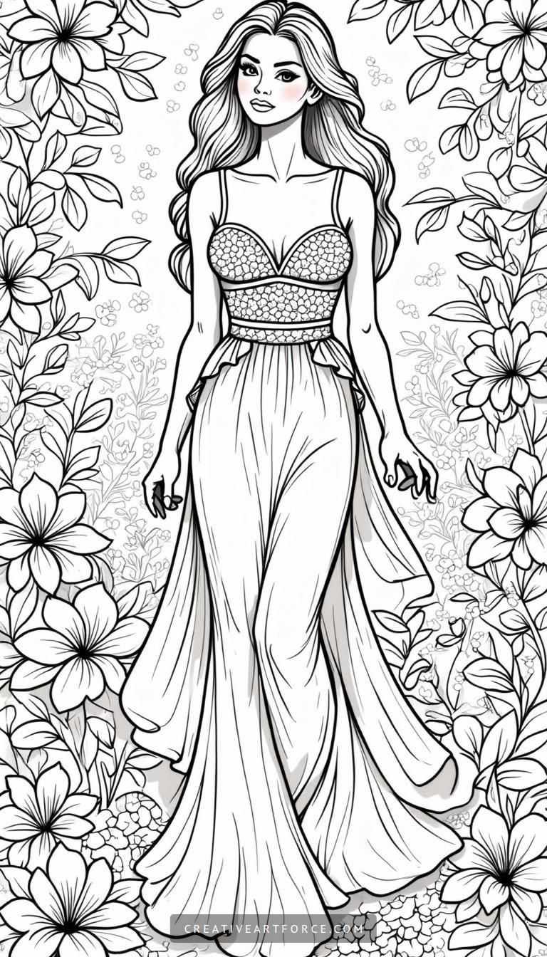 When it comes to coloring your elegant woman surrounded by flourishing flowers and leaves, the choices are endless and exhilarating. , allowing one to channel soft energy while adding painterly glamour to her flowing garments. Think of hues such as lavender, sky blue, or mint green. These colors not only infuse elegance into the figure but also contribute to a serene atmosphere on the page.