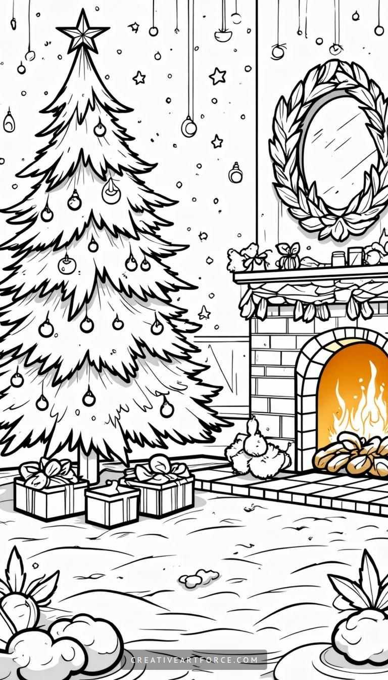 Free Printable Cozy Winter Scene Coloring Pages with Christmas Tree and Fireplace