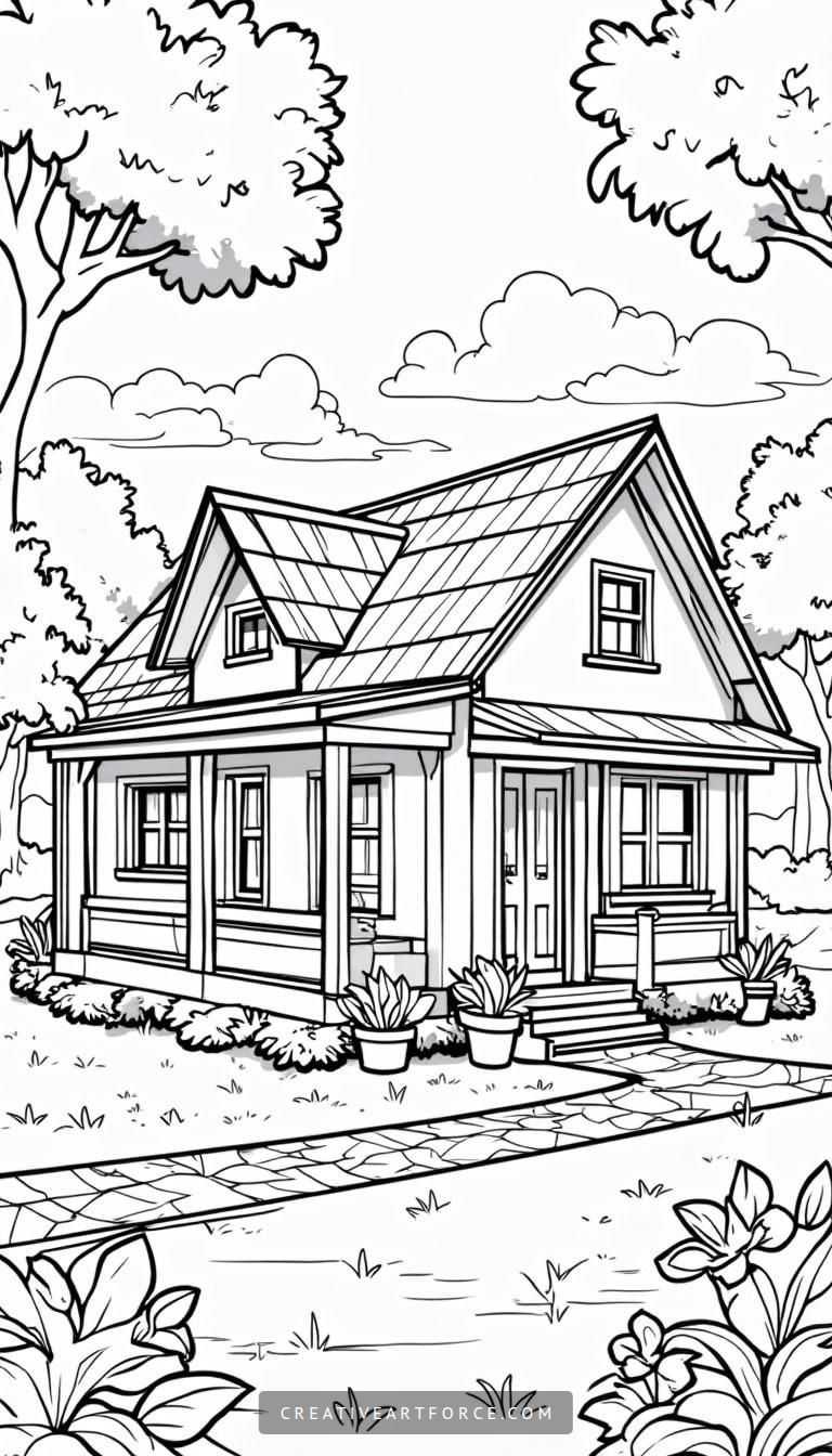 The illustrations feature a beautiful house with a pointed roof, a welcoming front porch, and delightful flower pots adorning the entrance. These designs allow you to play with endless color combinations, bringing your vision of a cozy home to life. Whether it’s the vibrancy of summer flowers or the warm tones of a sunset, each page invites you to express your unique aesthetic.
