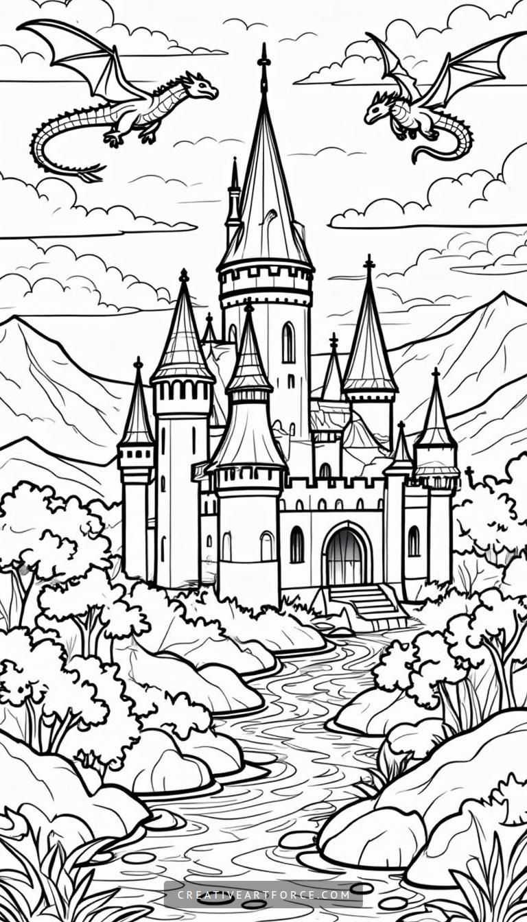 Coloring pages are a delightful avenue for creativity and relaxation, allowing both children and adults to immerse themselves in a world of imagination. Today, we explore a captivating subject: a medieval castle nestled amidst lush forests and majestic mountains, accompanied by mythical dragons soaring through the skies. By the end of this article, you’ll find this enchanting scene turned into a free printable coloring page that you can enjoy at home.