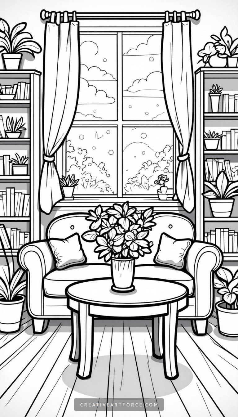 Imagine stepping inside a warm, inviting home. There’s a comfy sofa where you can curl up with your favorite book, a rugged bookshelf brimming with stories waiting to be explored, and vibrant house plants adding life to the space. Our are inspired by such enchanting settings. With just a few strokes of color, you’ll be able to create an idyllic escape right on the page in front of you.