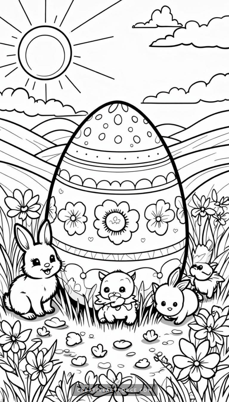 Imagine diving into a world where your imagination takes the lead, bringing to life a delightful black and white drawing of an enchanting Easter scene. In your mind’s eye, picture a captivating illustration that features a large decorated egg, whimsical bunnies frolicking amidst vibrant blooms, and cheerful chicks chirping joyfully. Set against a backdrop of rolling hills and a bright sun, these elements create a visual feast that invites creativity and relaxation.