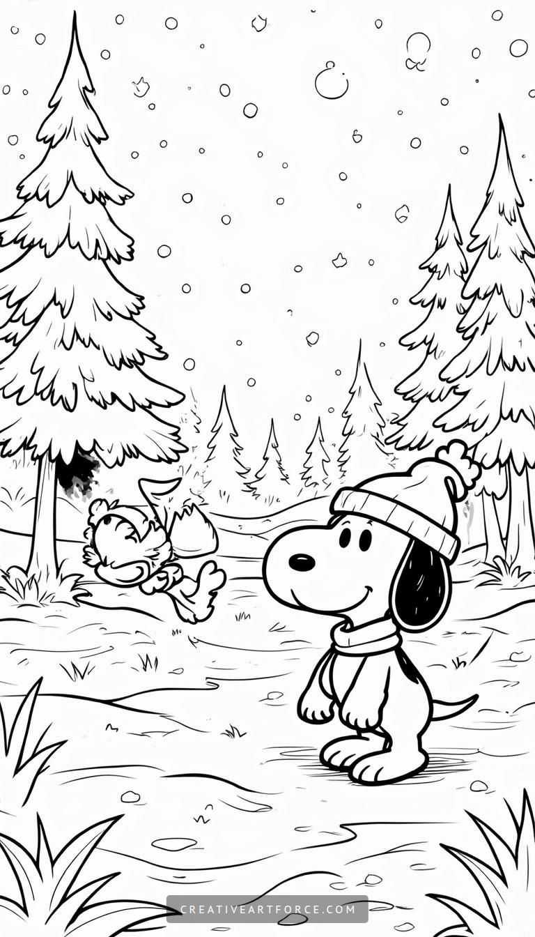 Free Printable Coloring Pages of Snoopy and Woodstock in a Winter Wonderland