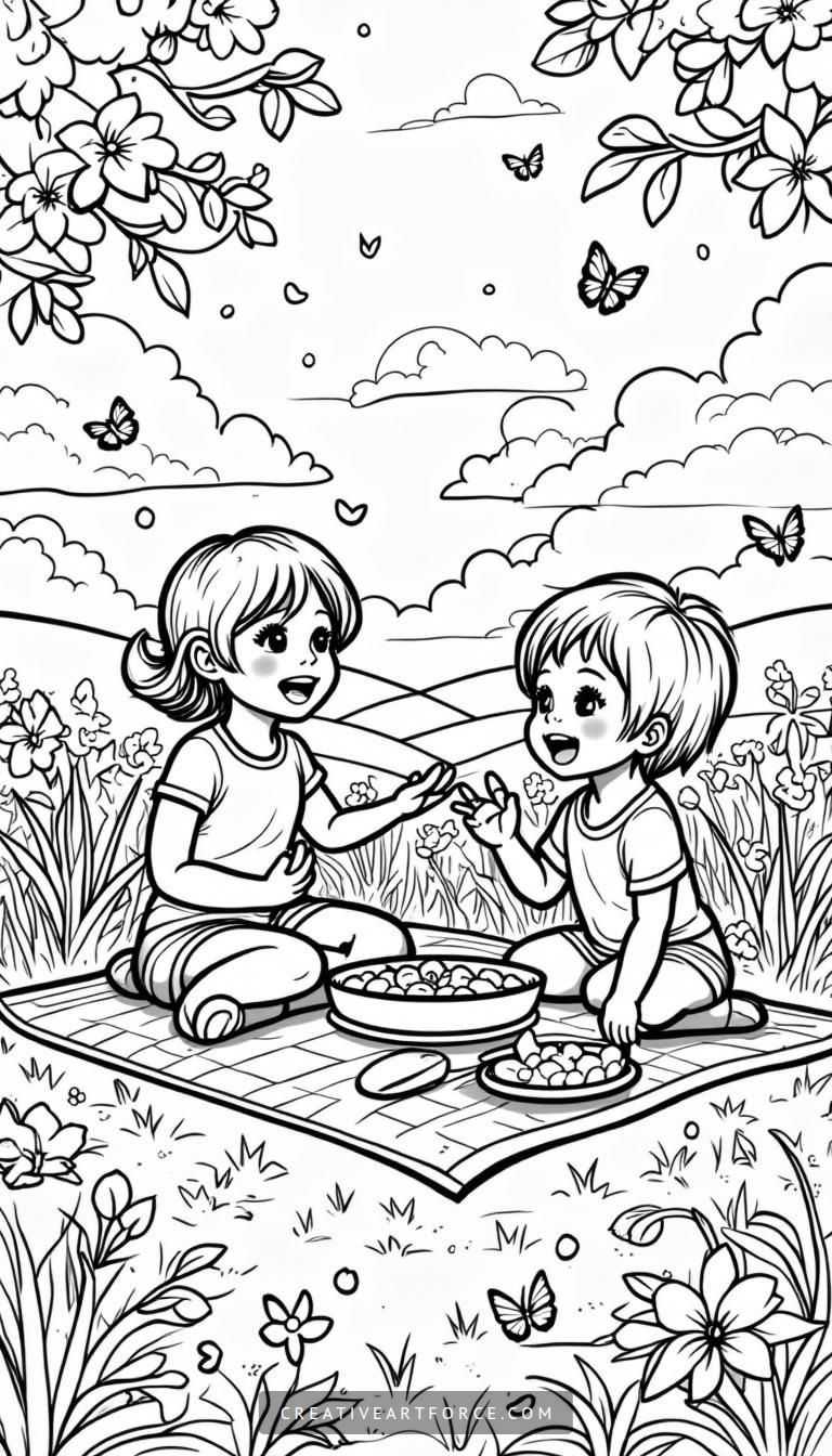 Coloring pages provide a unique opportunity for children to explore their creativity while engaging in a fun activity. In the spring-themed coloring pages we’re sharing, children can immerse themselves in scenes of joyful kids playing in blooming fields, butterflies fluttering about, and colorful picnics waiting for their delightful snacks. These illustrations are designed to capture the essence of spring and ignite imaginations.