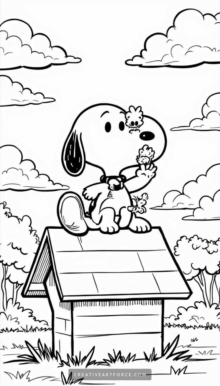 Imagine spending a few quiet moments bringing a black-and-white drawing of Snoopy lounging on his doghouse to life, with Woodstock playfully perched on his nose. It’s a delightful scene that invites your creativity and provides a mental escape from the hustle and bustle of daily life. The simple act of coloring can reduce stress, improve focus, and foster mindfulness, helping you find peace amid chaos. So grab your markers or colored pencils, and let’s jump into the joyful world of coloring with Snoopy and Woodstock!