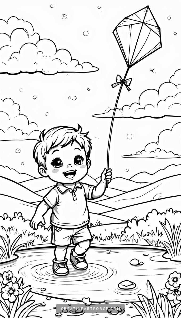 Imagine a delightful spring day where the breeze whispers secrets to the trees, prompting our young protagonist to embark on a sky-high adventure. Picture a boy, his laughter mingling with the wind, as he stands amidst rolling green hills. He’s holding a kite that dances with the gusts, painting the sky with joy. This enchanting black and white drawing captures the charm of such a moment, inviting you to dive into a world of creativity where coloring knows no bounds.
