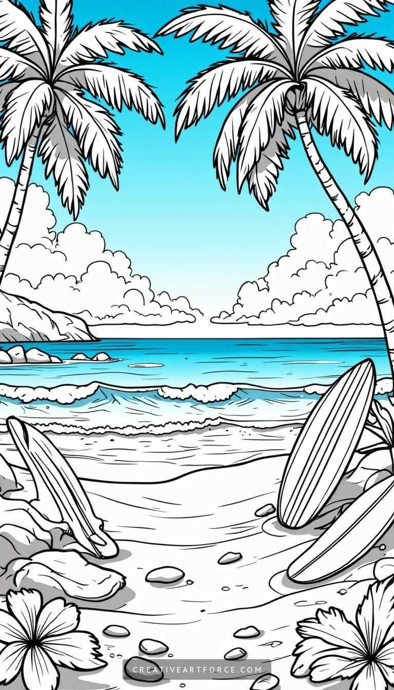 Coloring often serves as a delightful escape from the rush of life and opens the door to self-expression. But why choose a tropical beach scene? It’s simple—these depictions offer a chance to explore diverse colors and create a journey for your imagination. With a black and white drawing of a tropical beach, you can add vibrant hues to various elements such as the deep blue sky, gentle waves, and lush palm trees swaying in the breeze. This scene isn’t just visually appealing; it’s a canvas for your creativity to flourish.