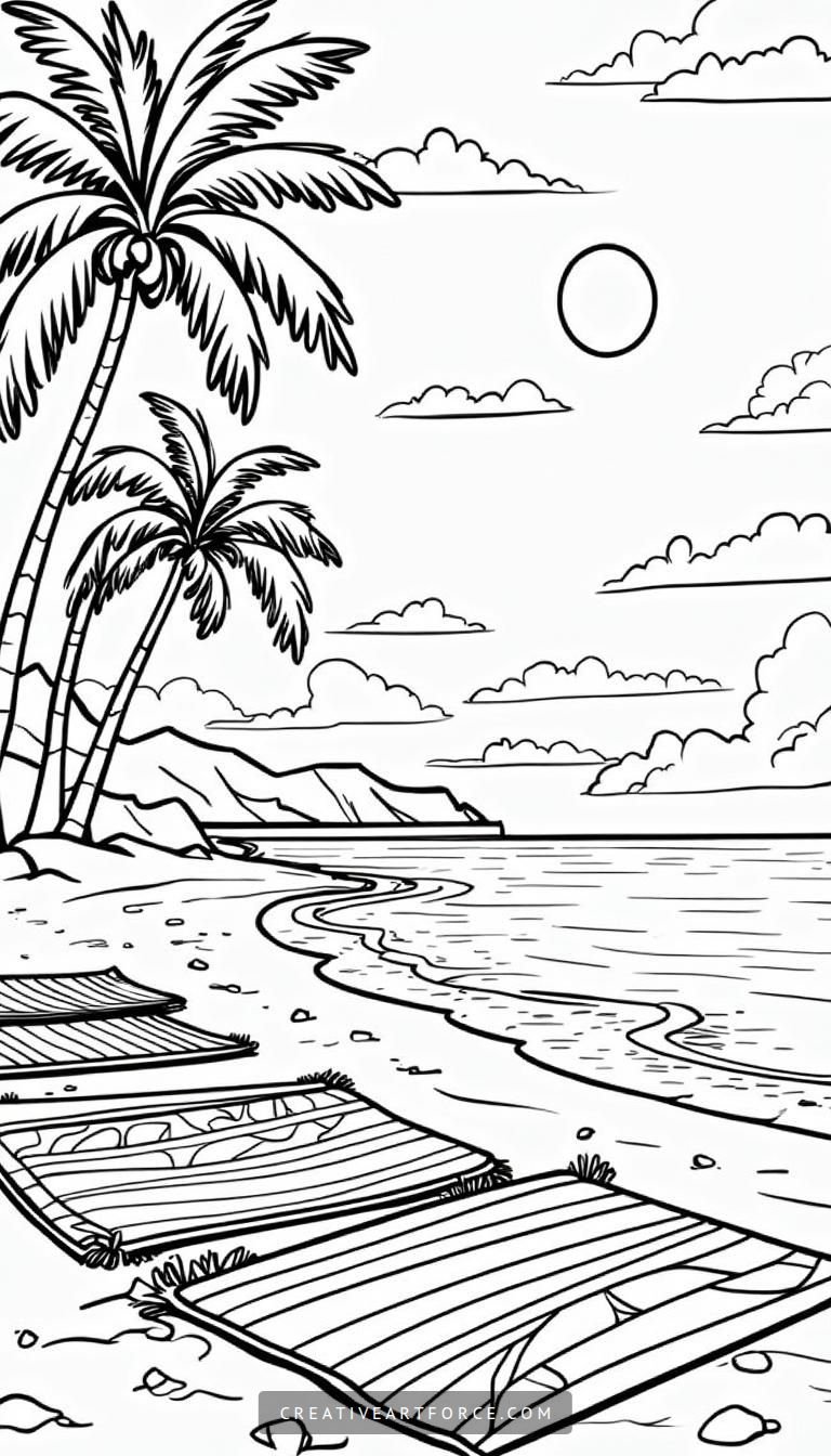 2. : Don’t hesitate to include your own elements in the coloring page. Once you’ve colored your scene, consider incorporating doodles or illustrations of beach items like seashells, starfish, or even your favorite summer drink.