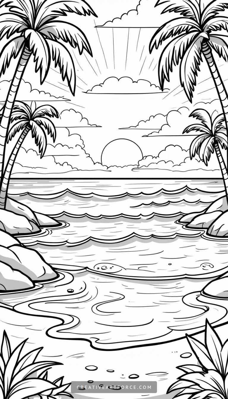 This collection features a stunning black-and-white illustration that invites you to add a splash of your favorite colors. Imagine a radiant sun shining overhead, the refreshing blues of the ocean kissing the shore, and vibrant greens of palm trees swaying in the gentle breeze. Sounds perfect, doesn’t it? Grab your colored pencils, markers, or crayons, and gear up for a fun-filled coloring experience that will brighten your day!