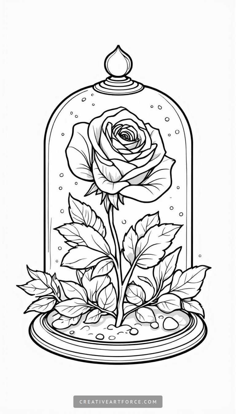 This coloring page showcases the intricate design of a rose encased in a glass dome, surrounded by lush foliage. With soft, inviting outlines, this artwork provides the perfect canvas for your creative expression.