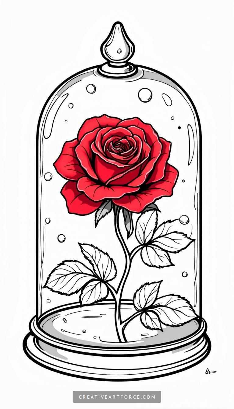 Visually, a glass dome adds an enchanting element to the simple yet intricate design of a rose. The dome’s soft gray shading creates a gentle contrast with the vibrant red of the rose. This interplay between light and shadow can inspire colorists to explore various shading techniques and color palettes.