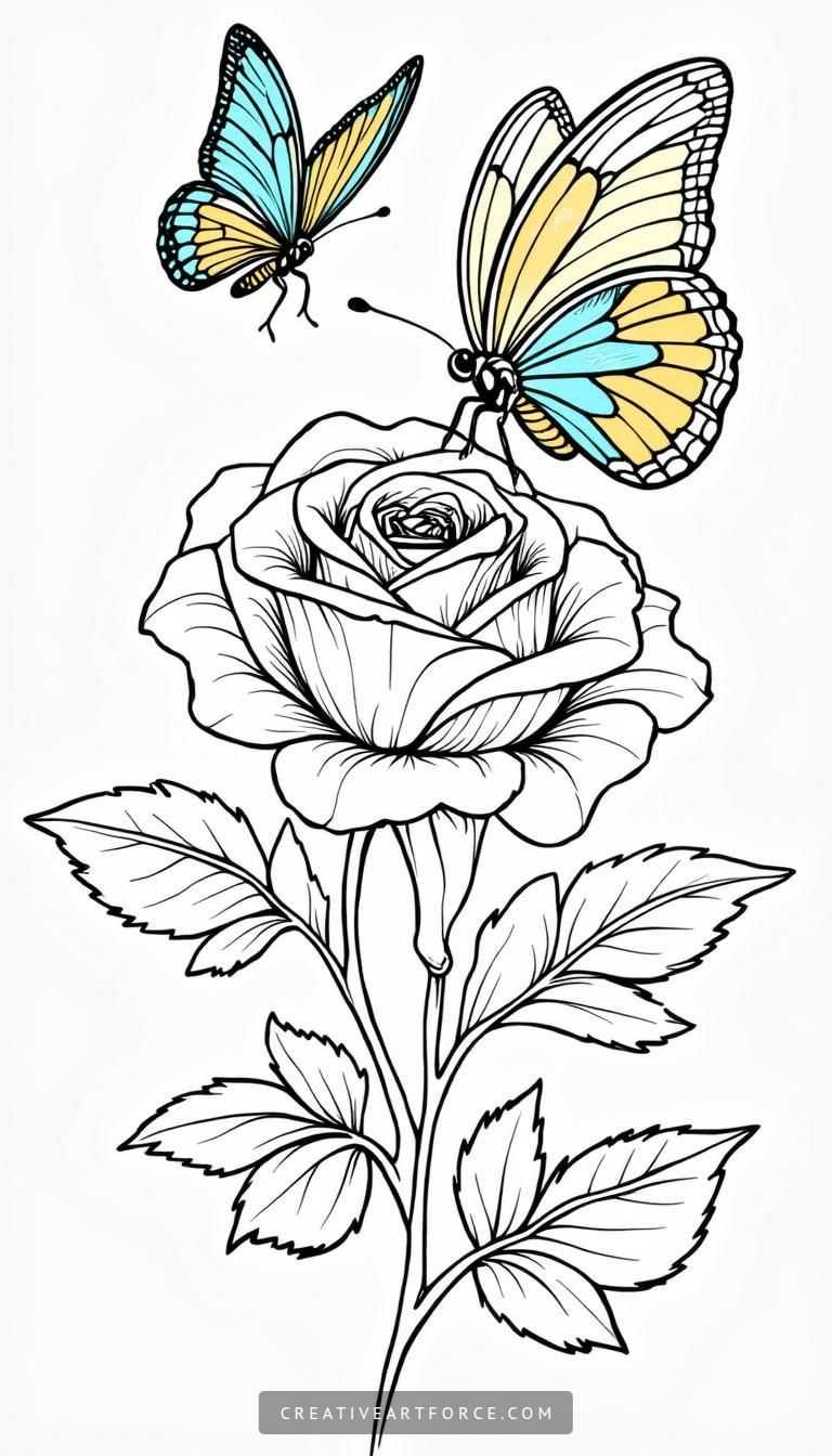 Free Printable Coloring Pages of a Delicate Rose and Whimsical Butterfly