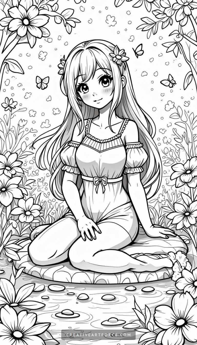 Free Printable Coloring Pages of Serene Anime Woman in a Blooming Garden