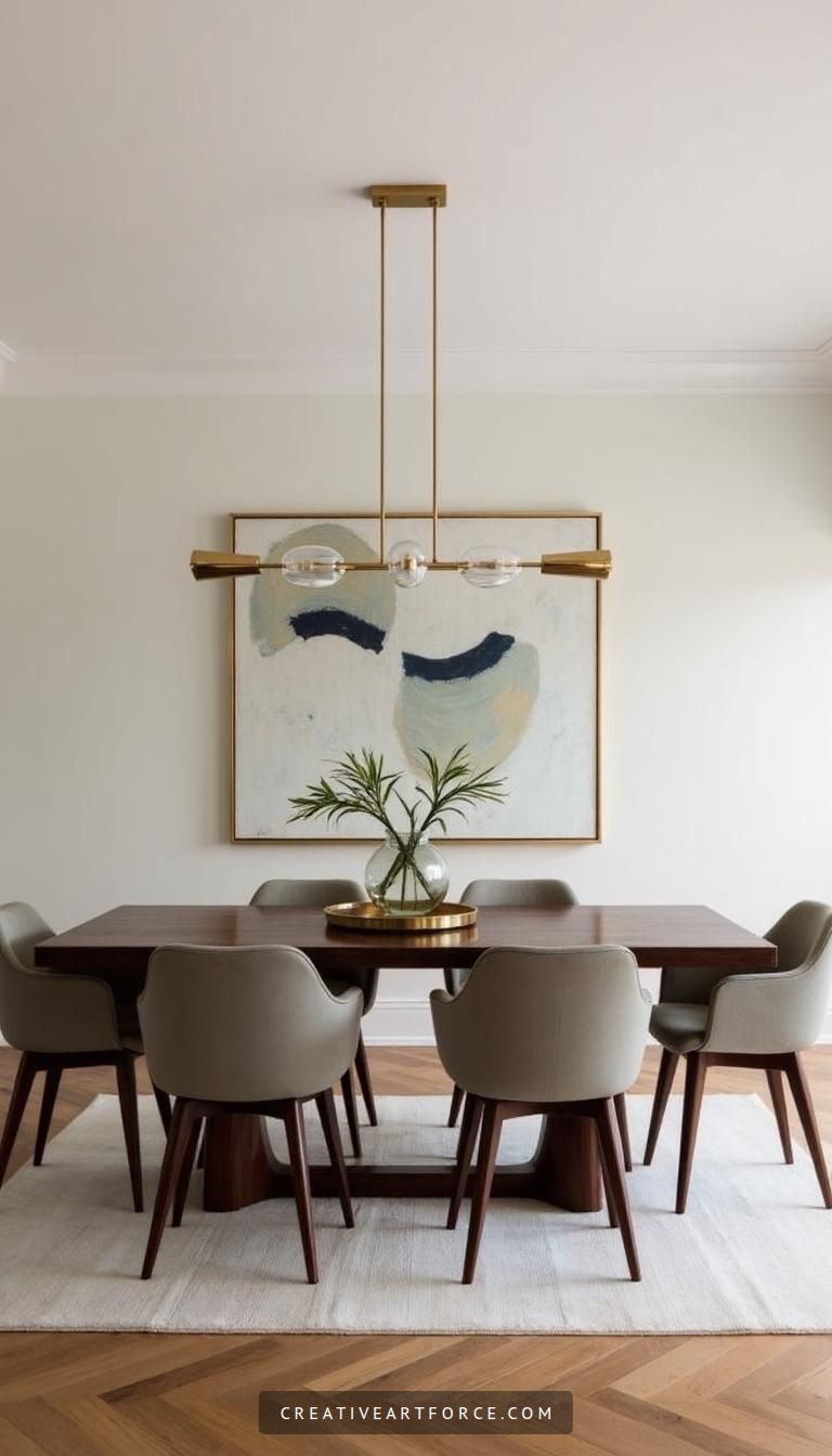 Lastly, accessorizing is key. Introduce bold artwork that reflects the era’s geometric patterns, as well as decorative elements like sculptures or vintage ceramics. Don’t shy away from adding a few potted plants for a touch of greenery—botanical elements balance man-made items and create a sense of warmth in your dining space. Family heirlooms or thrifted finds can tell a story and enrich the room’s character, making your dining area not just a place to eat but a reflection of your unique style and inviting personality.