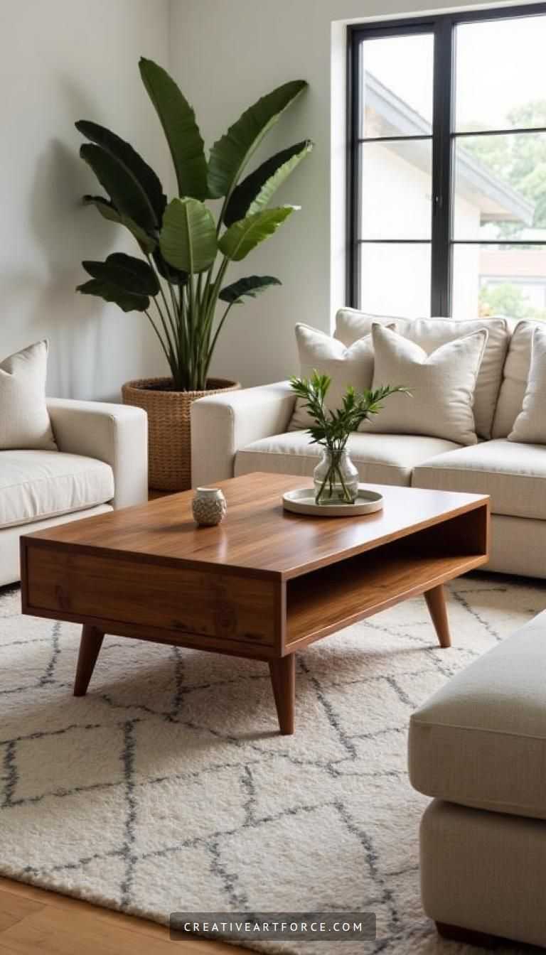 Lighting also plays a crucial role in styling. Positioning a small table lamp or a set of candles can elevate the atmosphere, turning your living room into a cozy haven in the evenings. The goal is to create a space that’s not only visually appealing but also functional, encouraging gatherings and relaxation. By thoughtfully curating your coffee table’s decor, you can enhance the beauty of your walnut mid-century modern table and create a stunning living room centerpiece.