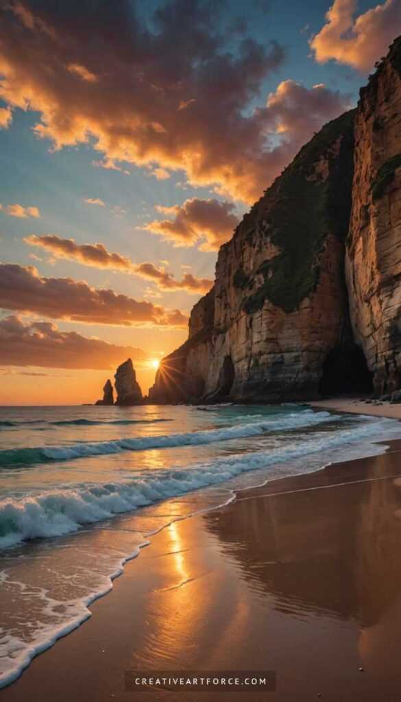 The ruggedness of ocean cliffs juxtaposed with the soft caress of gentle waves paints a serene coastal experience. As the sun dips lower on the horizon, the waves reflect the sky’s vibrant colors, creating a mirror-like effect on the water’s surface. This interplay between land, water, and sky offers not just a visual feast, but also ignites a profound sense of peace and reflection.