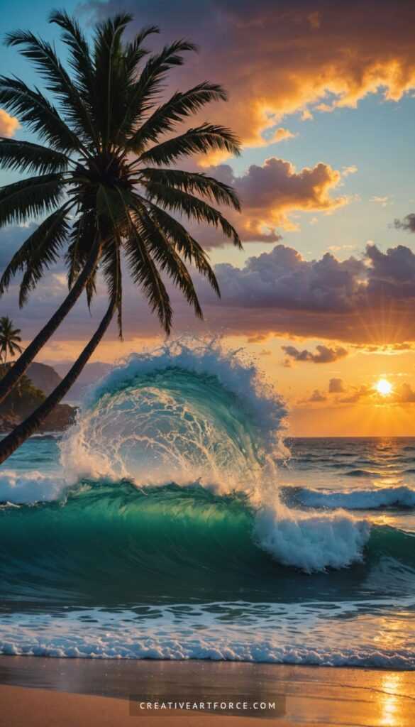There is something undeniably captivating about a tropical beach at sunset. The sky transforms into a breathtaking canvas of warm oranges, pinks, and purples, while gentle waves caress the shoreline. Against this vibrant backdrop, palm trees stand tall, their silhouettes etching an iconic tropical scene that invites calm and reflection. This natural spectacle offers not just a feast for the eyes, but also a deep sense of serenity and connection with nature.
