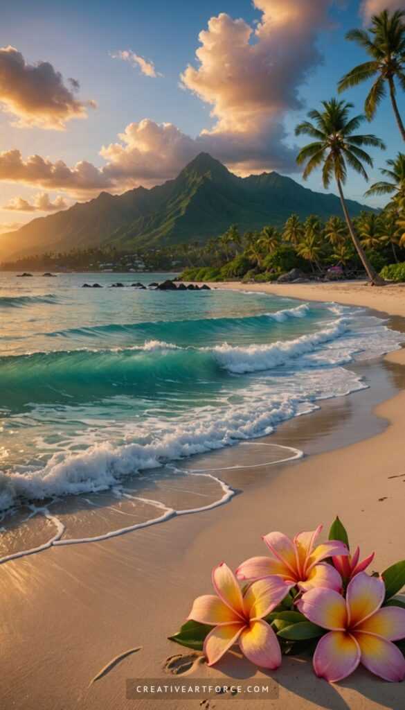 The combination of a breathtaking 4K beach sunset, swaying palms, vibrant plumeria, and majestic mountains creates an idyllic tropical paradise that captivates every sense. This breathtaking scene is a reminder of the beauty and tranquility that nature offers, an invitation to dream, reflect, or simply revel in the moment. Whether viewed in person or through a screen, these elements blend seamlessly to create memories that last a lifetime.